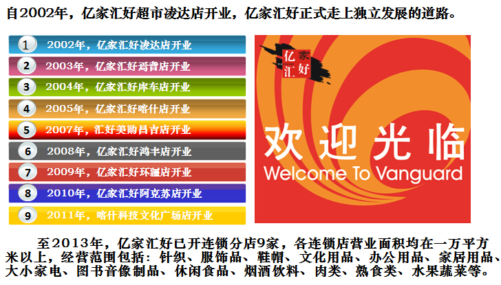 億家匯好商貿有限責任公司于2002年成立,并從臺灣引進連鎖經營職業(yè)管理團隊,統(tǒng)一管理旗下各地的連鎖超市。公司通過多年的穩(wěn)健發(fā)展,至2013年底,億家匯好商貿有限責任公司已成為擁有員工近3000多人,下轄一個配送中心和9家連鎖超市的大型綜合性零售企業(yè)。總經營面積11萬多平方米,配送中心輻射公司所有超市,年配送額可達2億元。公司大量吸納下崗職工,經過崗前培訓,提高勞動技能,實現(xiàn)了他們的再就業(yè),為維護社會和諧穩(wěn)定做出了貢獻。2013年,巴州億家匯好商貿有限責任公司在自治區(qū)零售業(yè)中穩(wěn)踞前三位,是自治區(qū)重要的流通龍頭企業(yè),2013年年銷售收入達10億人民幣。多年來,公司一直重管理、抓實效、運用先進的管理手段和營銷理念,秉承億家匯好人 時時尋求效率創(chuàng)新,事事講究專業(yè)技術的文化精髓,創(chuàng)造了良好的經濟效益和社會效益。公司先后多次被消費者協(xié)會評為誠信單位,并多年被評為重合同,守信用單位。